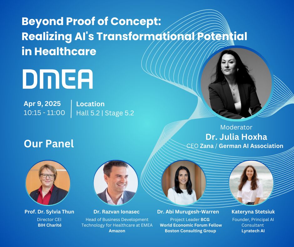 This panel discussion at DMEA Berlin, organized by the KI Bundesverband, focuses on overcoming barriers to large-scale AI deployment in healthcare. While 2024 has seen many proof-of-concept implementations, especially with Generative AI, the challenge lies in scaling these solutions for real clinical and operational impact. The panel brings together industry leaders, startup innovators, and consulting experts to discuss strategies for moving AI beyond pilots to create lasting transformation in healthcare.