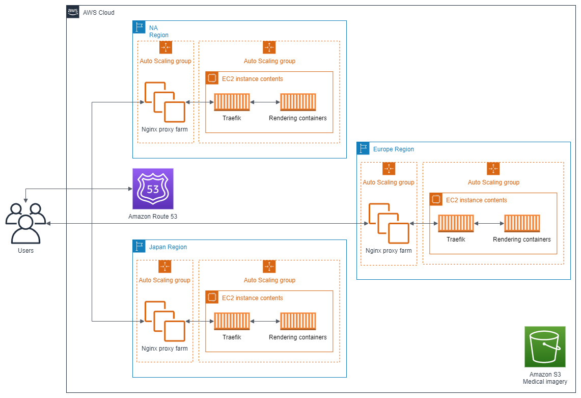 Low-latency and scalable web-based viewer Today, most viewing and processing of medical imaging data in both clinical and research environments happens on-premises on dedicated workstations capable of server-side rendering necessary for routine manipulations such as MIP (maximum intensity projection) viewing or 3D volumetric rendering. With the increased collaboration between radiologists from many institutions spread across the world as well as the rise in secondary usage of medical imaging for research and development of ML solutions, there is a need for globally available solutions. This very challenge was faced recently by Radboud University Medical Center in Nijmegen as they received great interest from radiologists worldwide for their CO-RADS Academy solution that teaches physicians how to read COVID-19 CT images. The Diagnostic Image Analysis Group (DIAG) developed a web-based medical imaging viewer called CIRRUS, which is built on MeVisLab from MeVis Medical Solutions. CIRRUS enables the use of many tools that radiologists require for interacting with medical imaging data. Server-side rendering is used for rapid loading of the medical imaging data and allows the use of powerful rendering hardware for 3D multiplanar reformation, pre-loading of series in memory and GPU acceleration. The rendered scenes are streamed to the client over a WebSocket connection to a VueJS single page application to also gain the strengths of client-side interactions where necessary. These workstations are deployed using Docker containers, and one container image is launched per user with the users being routed to their container instance with Traefik. In this project, DIAG was able to set up rendering servers on AWS in Europe, Japan, and North America on Amazon Elastic Compute Cloud (Amazon EC2). To start the container on-demand for a new user, it takes less than 30sec and we are able to horizontally scale the compute pool by adding additional EC2 instances in each Region. The medical imaging data are stored in an Amazon S3 bucket in Europe. To ensure rapid loading times in North America and the Asia Pacific Regions we used Amazon CloudFront to cache the data on demand. The loading performance for a typical 300MB CT, 500 slices CT studies is less than 10 seconds. With a latency of 20ms, there is no observer delay in scrolling, which provides a great user experience.